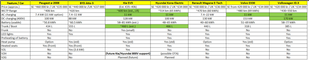 Comparison smaller, popular EV’s
