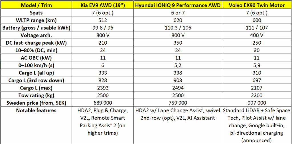 KIA EV9 vs Hyundai Ionic 9 vs Volvo EX90